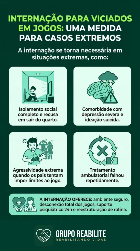 Uma clínica especializada oferece um ambiente de “detox digital”, removendo o paciente do ambiente viciante e proporcionando um tratamento intensivo para reabilitar suas habilidades sociais e tratar as comorbidades psiquiátricas. A internação voluntária, onde o próprio indivíduo busca ajuda, é o cenário ideal.