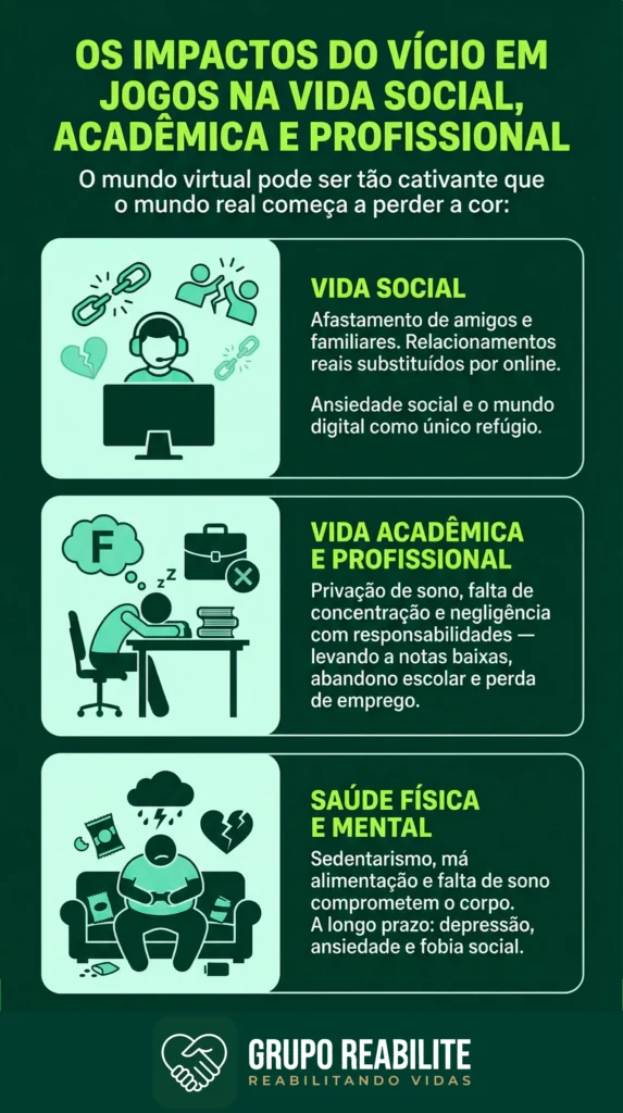 O mundo virtual pode ser tão cativante que o mundo real começa a perder a cor. As consequências do vício em jogos se manifestam em todas as áreas da vida: