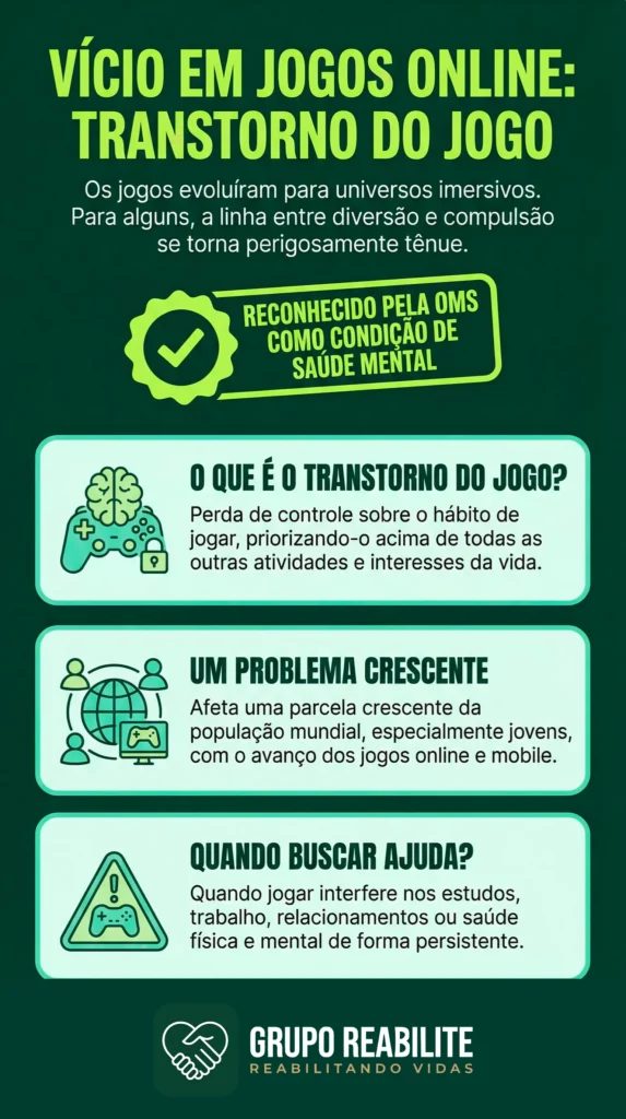 Essa dependência comportamental, embora não envolva uma substância química, ativa os mesmos circuitos de recompensa no cérebro que as drogas, podendo levar a consequências igualmente devastadoras na vida pessoal, social, acadêmica e profissional. Muitas vezes, o vício em jogos serve como uma fuga para transtornos subjacentes, como ansiedade social e depressão. O Grupo Reabilite compreende a seriedade da dependência digital e oferece orientação especializada para ajudar indivíduos e famílias a encontrar o tratamento adequado, seja ele ambulatorial ou, em casos extremos, a internação em clínicas especializadas.